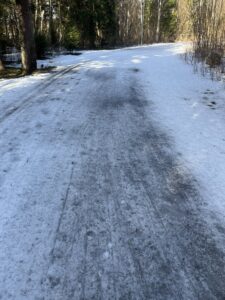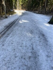 Rajaäärtes on küll veel veidi lund, kuid seegi on kuuseokkaid täis, mis pidurdavad libisemist ega sobi rajale visata. Lisaks ei saa meie tehnikaga jäiseid kohti ka lumeks/pehmemaks freesida.