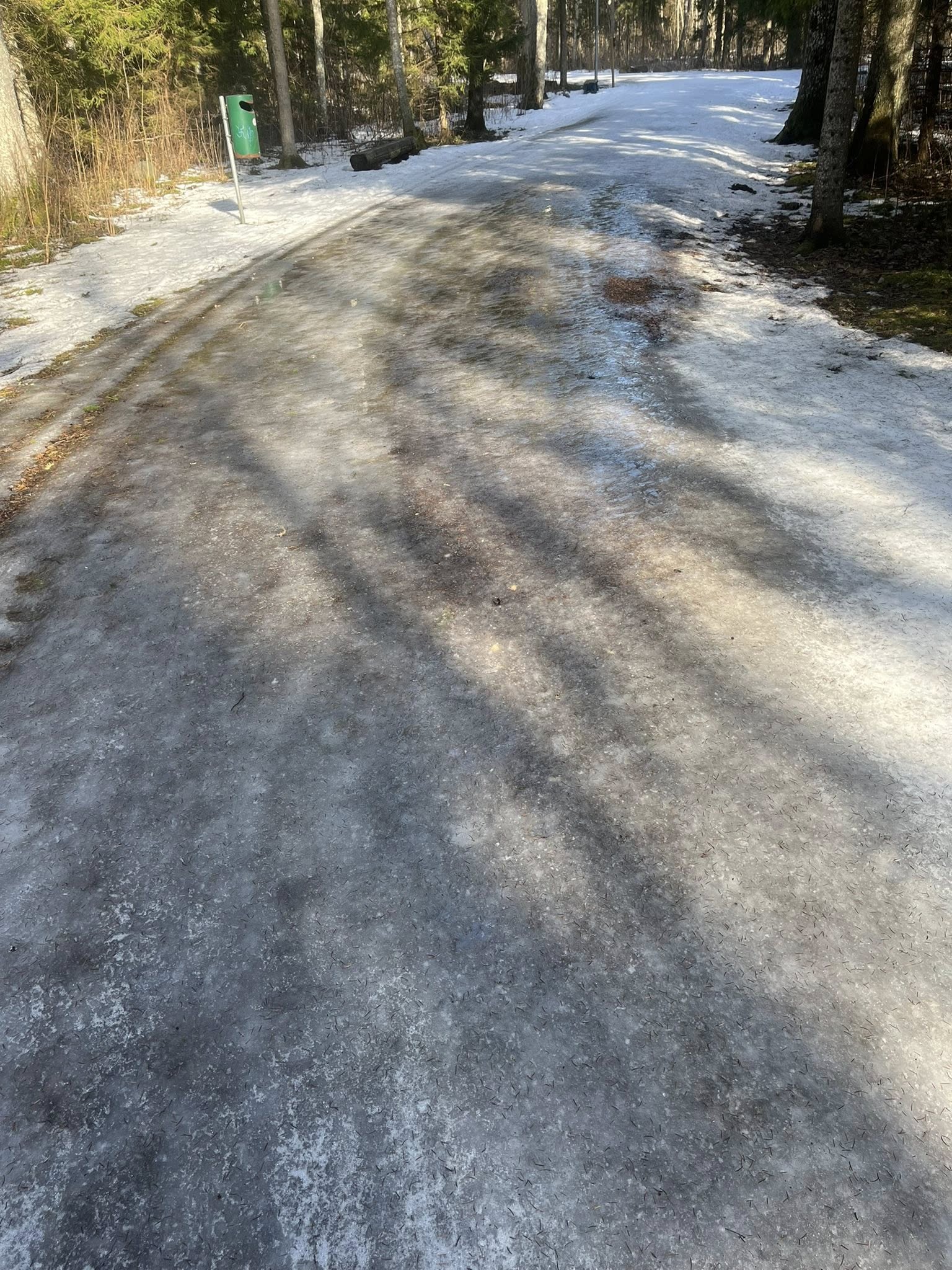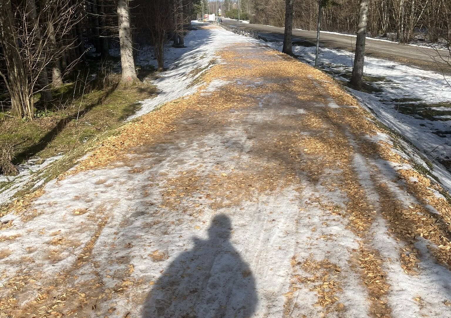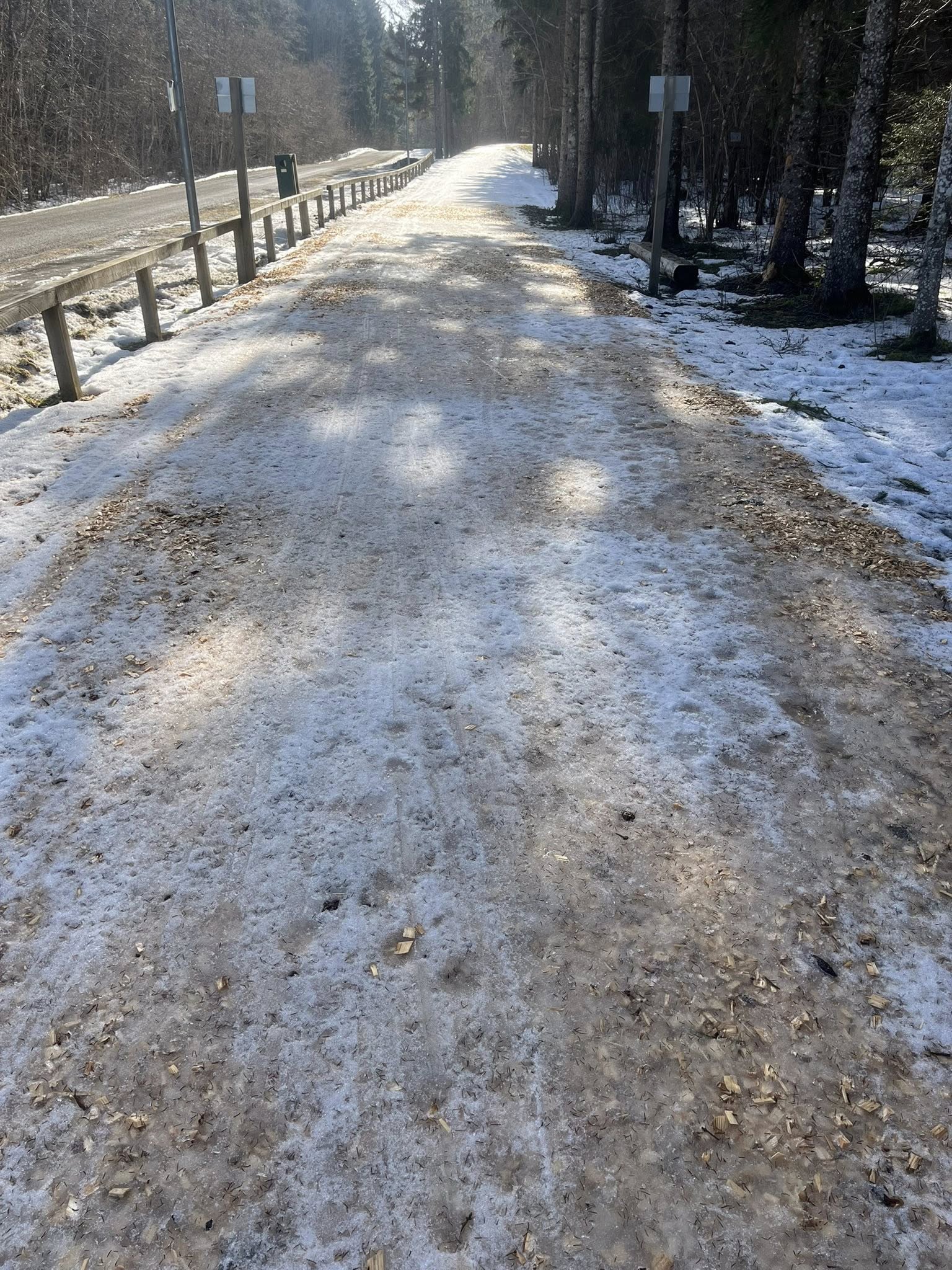 Rajaäärtes on küll veel veidi lund, kuid seegi on kuuseokkaid täis, mis pidurdavad libisemist ega sobi rajale visata. Lisaks ei saa meie tehnikaga jäiseid kohti ka lumeks/pehmemaks freesida.